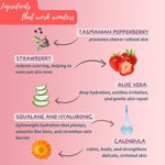 Aqua, Caprylic Capric Triglyceride, Isopropyl Myristate, Stearic Acid, Cetostearyl Alcohol, Aloe Barbadensis Leaf Extract, Propylene Glycol, Glycerine, Glycyrrhiza Glabra (Licorice) Root Extract, Olea Europaea (Olive) Fruit Oil, Butyrospermum Parkii(Shea Butter), Niacinamide, Theobroma Cacao (Cocoa) Seed Butter, Methylene Bis-Benzotriazolyl Tetramethylbutylphenol (and) Aqua (and) Decyl Glucoside (and) Propylene Glycol (and) Xanthan Gum, Diethylamino Hydroxybenzoyl Hexyl Benzoate, Ethyl Ascorbic Acid, Calendula Officinalis Flower Extract, Fragaria Chiloensis (Strawberry) Fruit Extract, Tasmannia Lanceolata (Tasmanian Pepperberry) Fruit Extract, Panthenol, Hyaluronic Acid, Phenoxyethanol, Triethylene Glycol, Xylitylglucoside (and) Anhydroxylitol (and) Xylitol, Cetearyl Alcohol (and) Cetearyl Glucoside, Squalane, Tocopherol, Co Enzyme Q 10, Tartaric